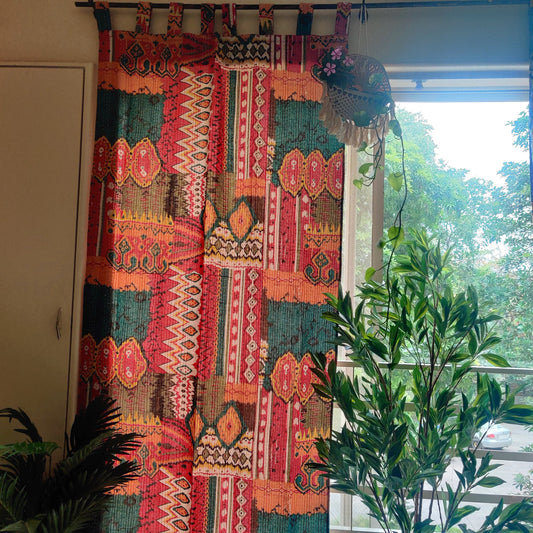 Eclectic red and blue kantha embroidered curtain panels, Boho colorful privacy curtains