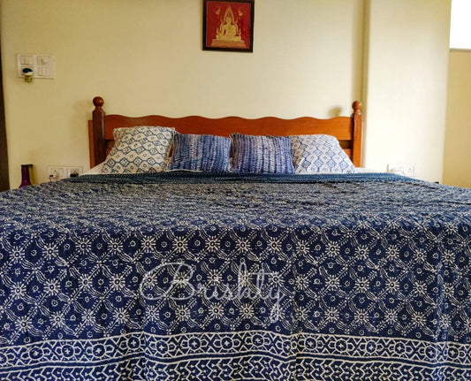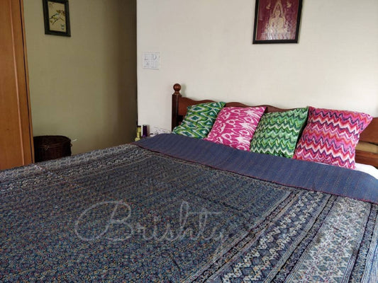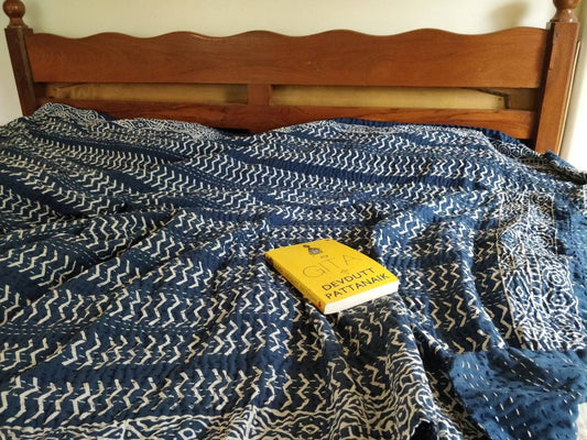 Indigo ajrakh block printed kantha bedcover