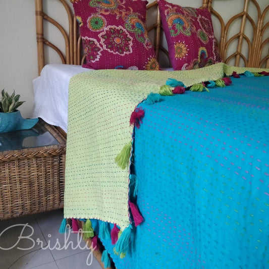 Reversible kantha throw bedcover with tassels