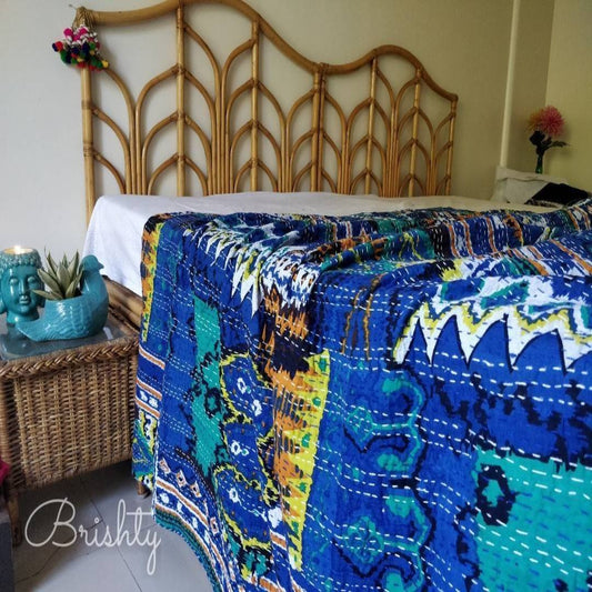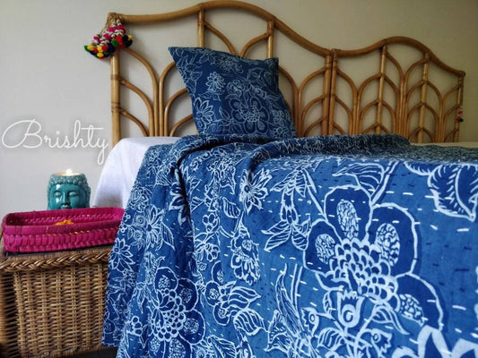 Indigo floral block printed kantha bedcover