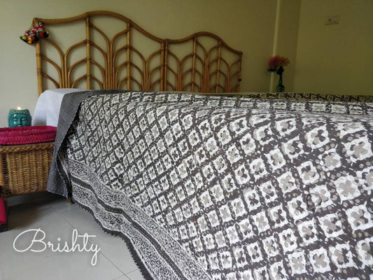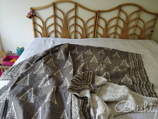 Neutral grey geometric block printed kantha bedcover
