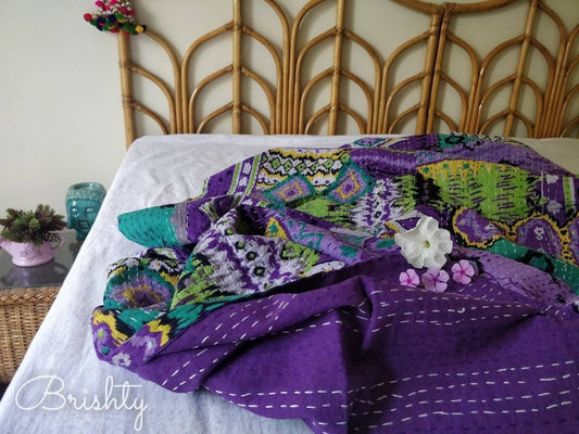 Colorful eclectic purple kantha bedcover