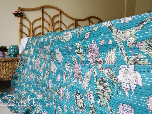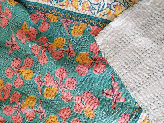 Teal floral kantha bedcover