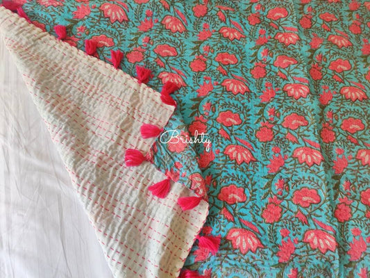 Block printed floral lightweight kantha throw bedcover with tassels