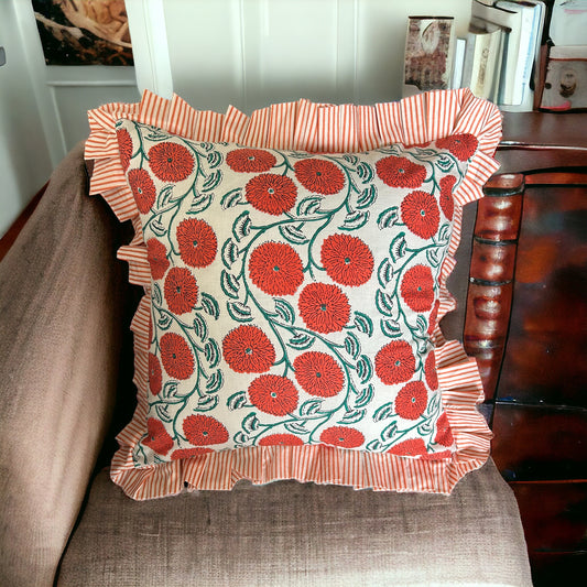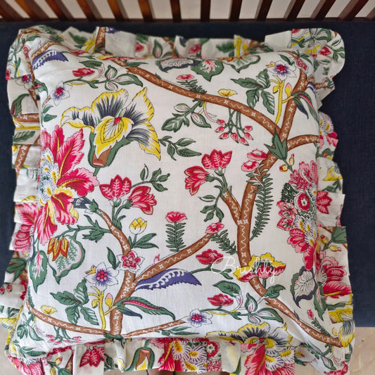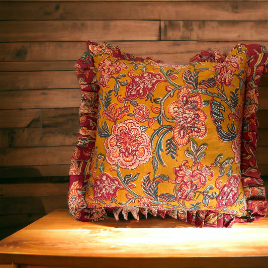 Hand-Block Printed Floral Cotton Cushion Covers in Maroon and Mustard yellow- with and without ruffles